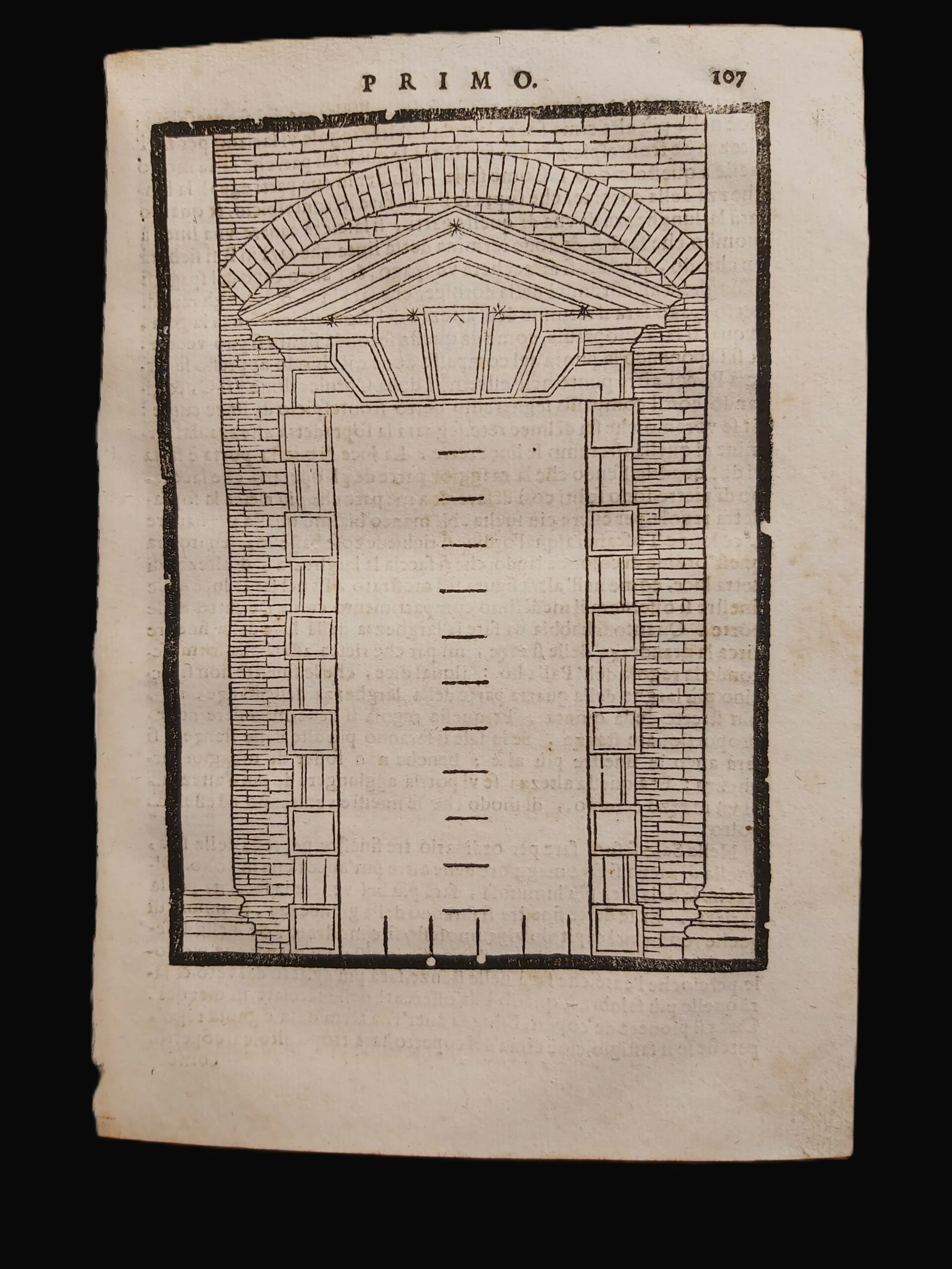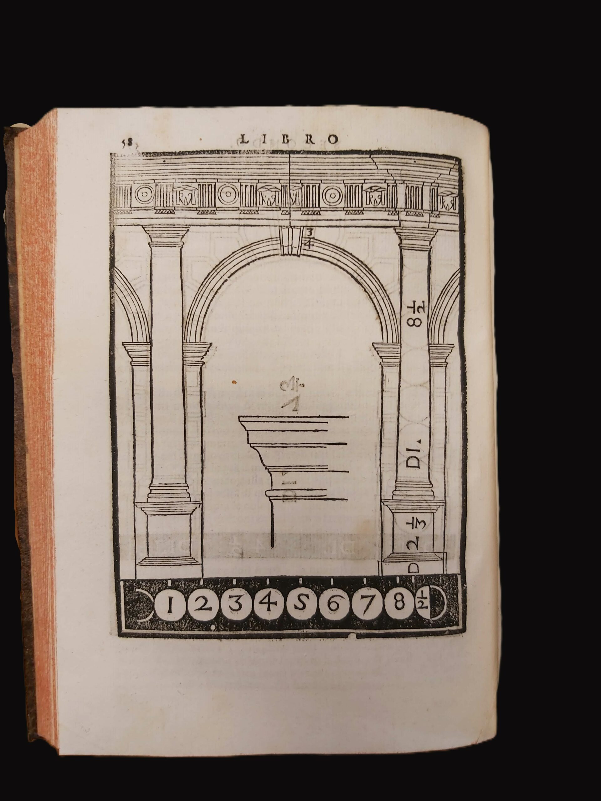 in-4 antico, pp. (8), 176, 192, (8), bella leg. settecentesca p. pelle con tass. al d. con nervi, tit. e fregi oro, tagli rossi. La seconda parte -con frontespizio proprio- reca il titolo: “Della Nuova Simmetria degli cinque ordini d’Architettura di… Opera necessaria negli adornamenti delle fabbriche, come Colonne, Cornici, Base, Capitelli, Pedestilli, Archi, intercolumnij. Il tutto con approbate ragioni vien descritto e mostrato nelli disegni”. Con 94 figure n. t. e tavv. inc. in legno. Seconda ediz. Riccardi II, 650-651: “Edizione assai più pregiata e completa della prima”. Cicognara 688. Olschki, Choix, 15413. Fowler 447. Piantanida 4430. Esempl. con errori nella numerazione delle pagine e alcune carte mal poste, ma assolutamente completo. Con chiose marginali di calligrafia antica. Ex libris xilogr. Minimi dif. alla leg. ma bell’esempl. [047]