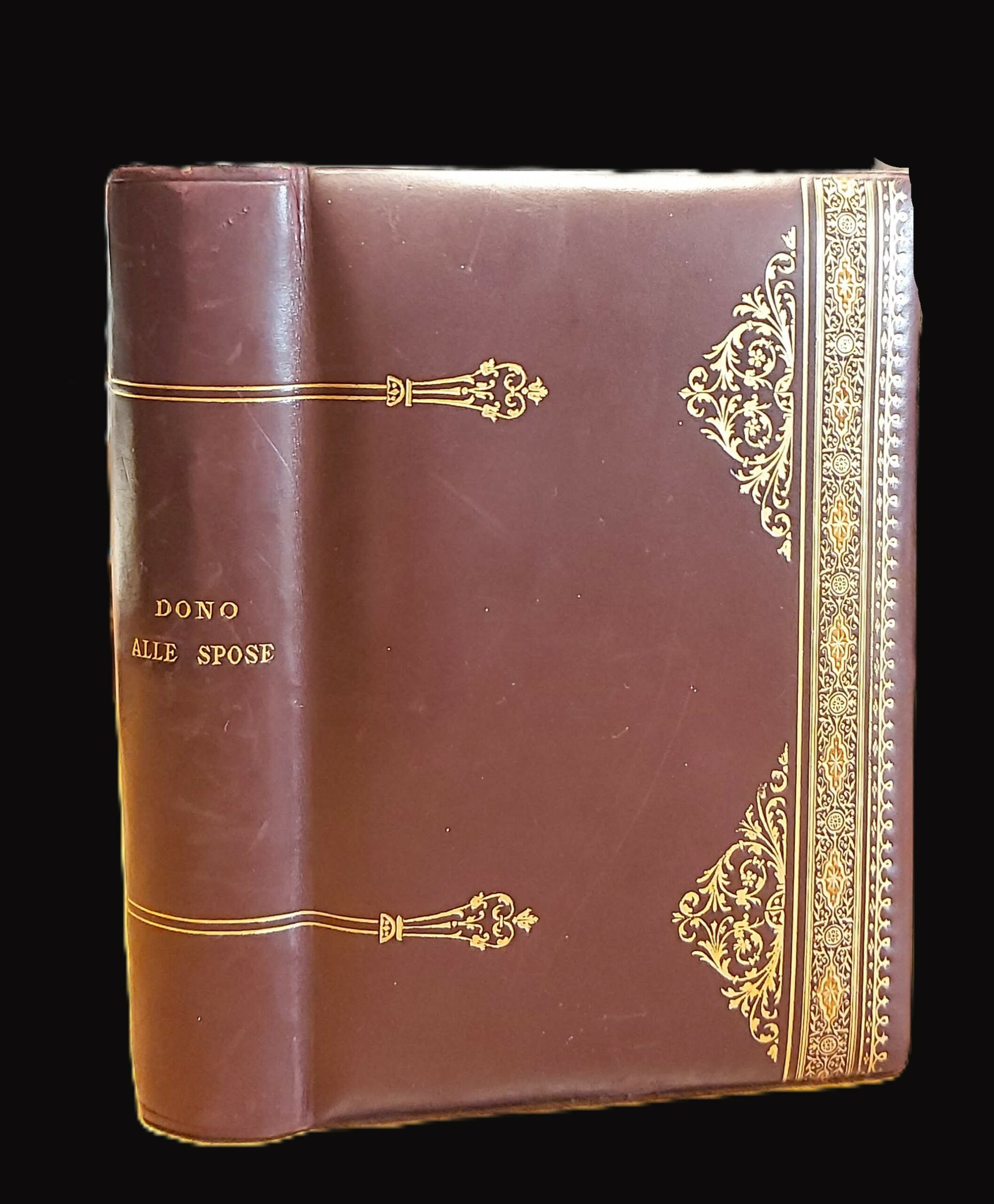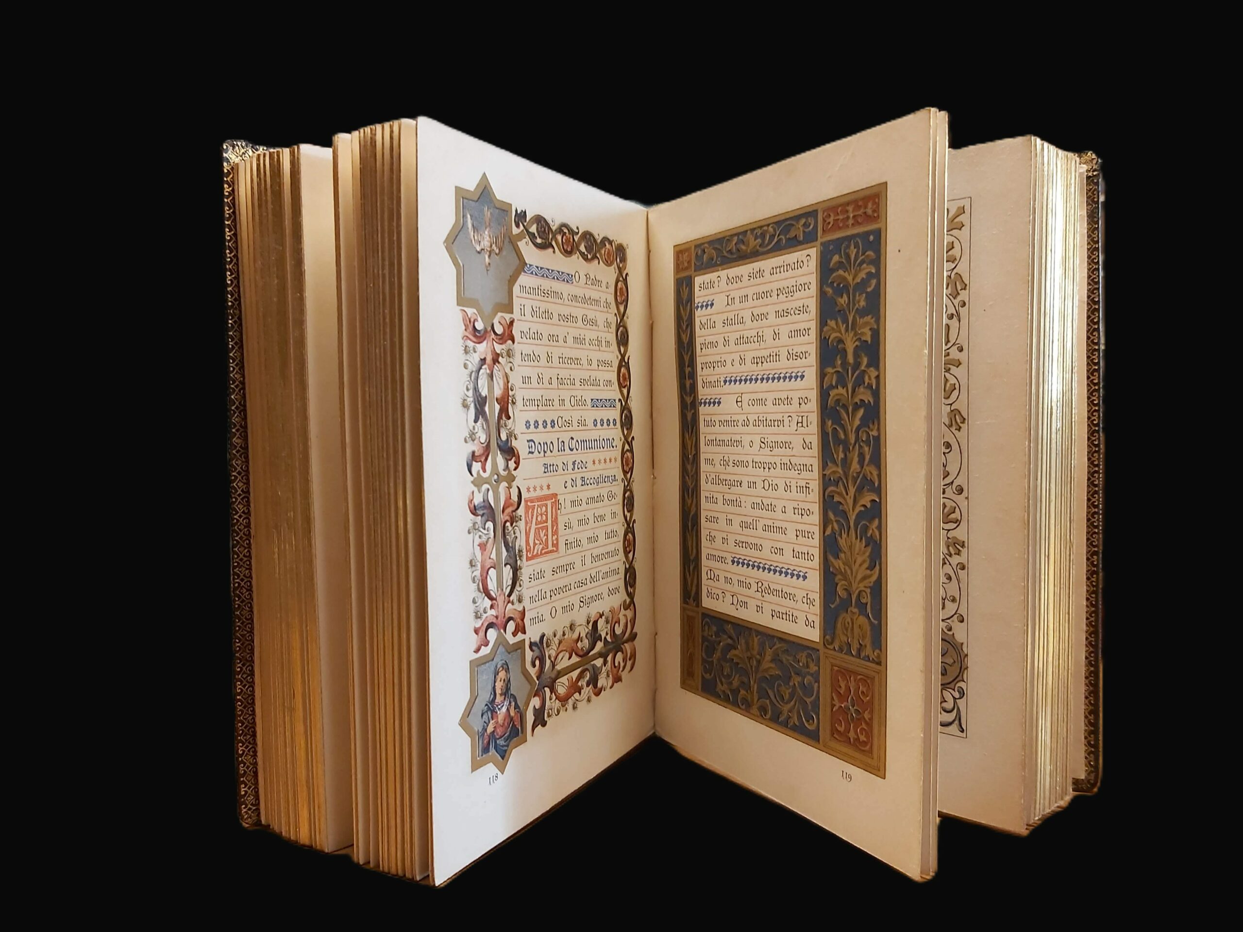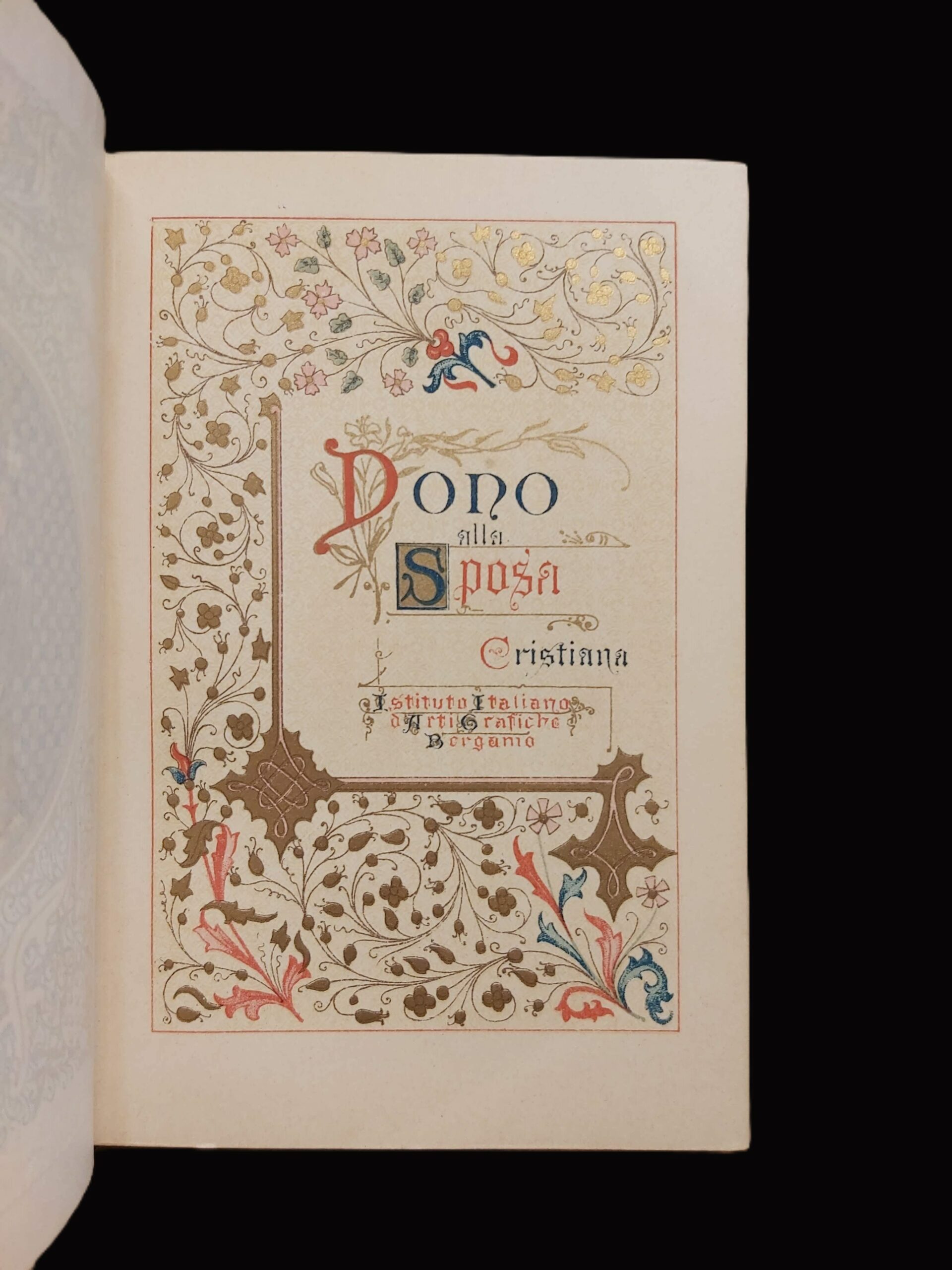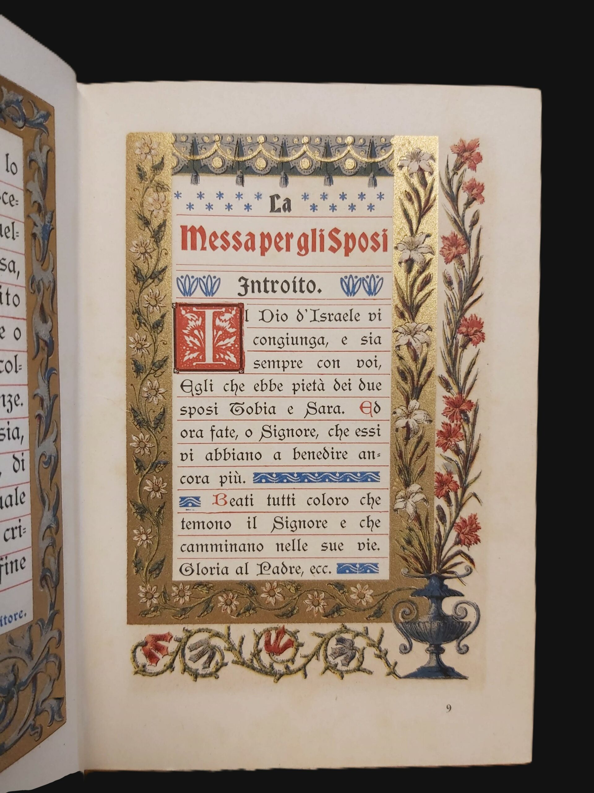 in-16, pp. 196, elegante leg. pelle con ricchi fregi oro ai piatti, dentelles, risguardi in carta dec., tagli dorati. Segnalibro. Raffinata edizione contenente il testo della Messa per gli Sposi, preghiere per varie occasioni, novene e litanie. Il tutto impresso a colori e con testo contornato da ricchi fregi in cromoltiogr. secondo il gusto degli antichi codici. Con alcune tavv. protette da veline. Firma di appartenenza sulla prima cb. Perfetto esempl. [790]