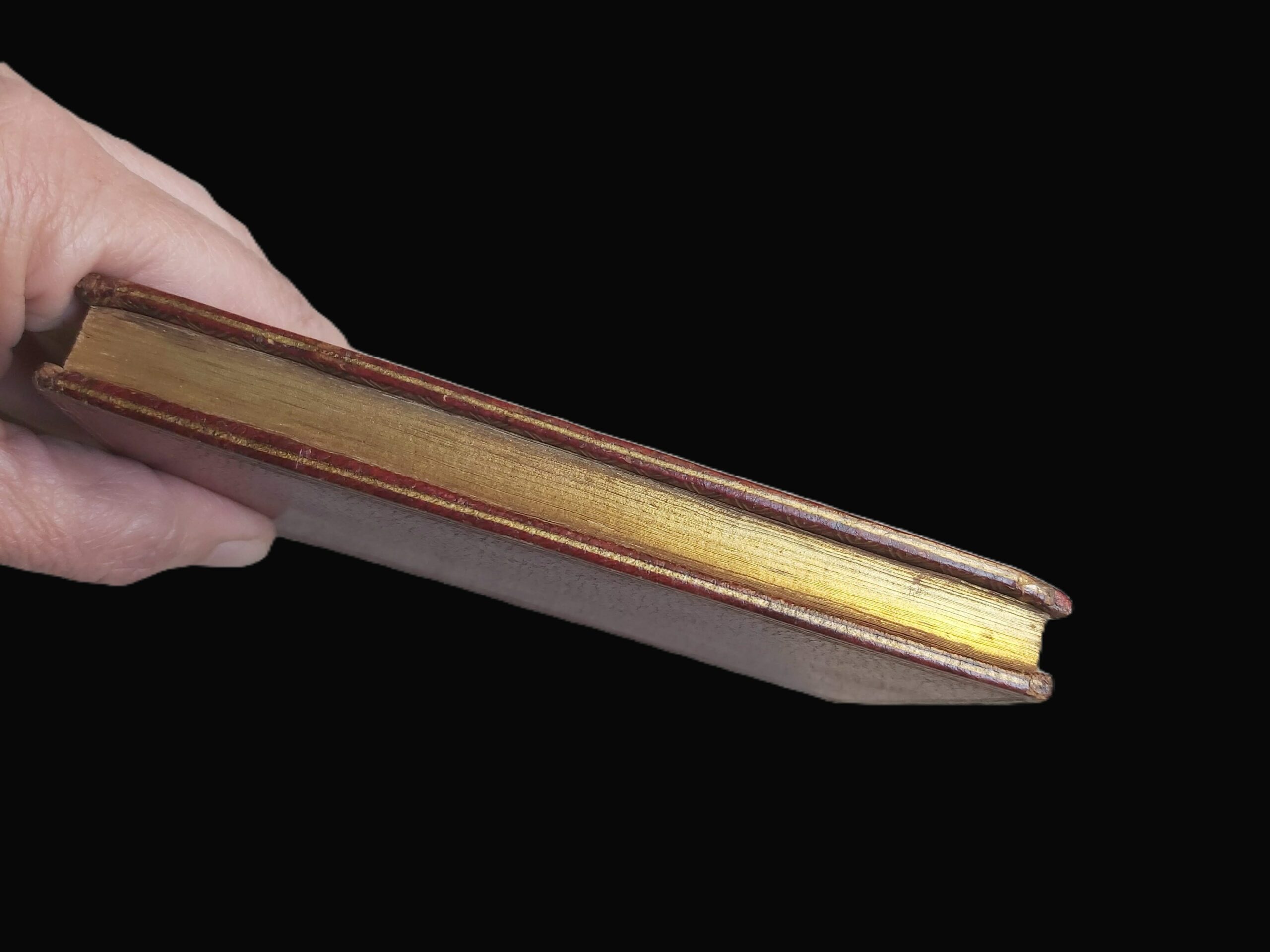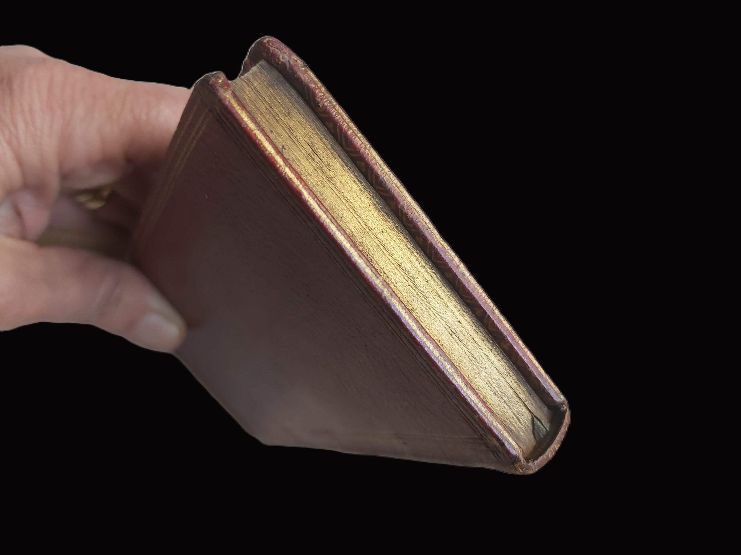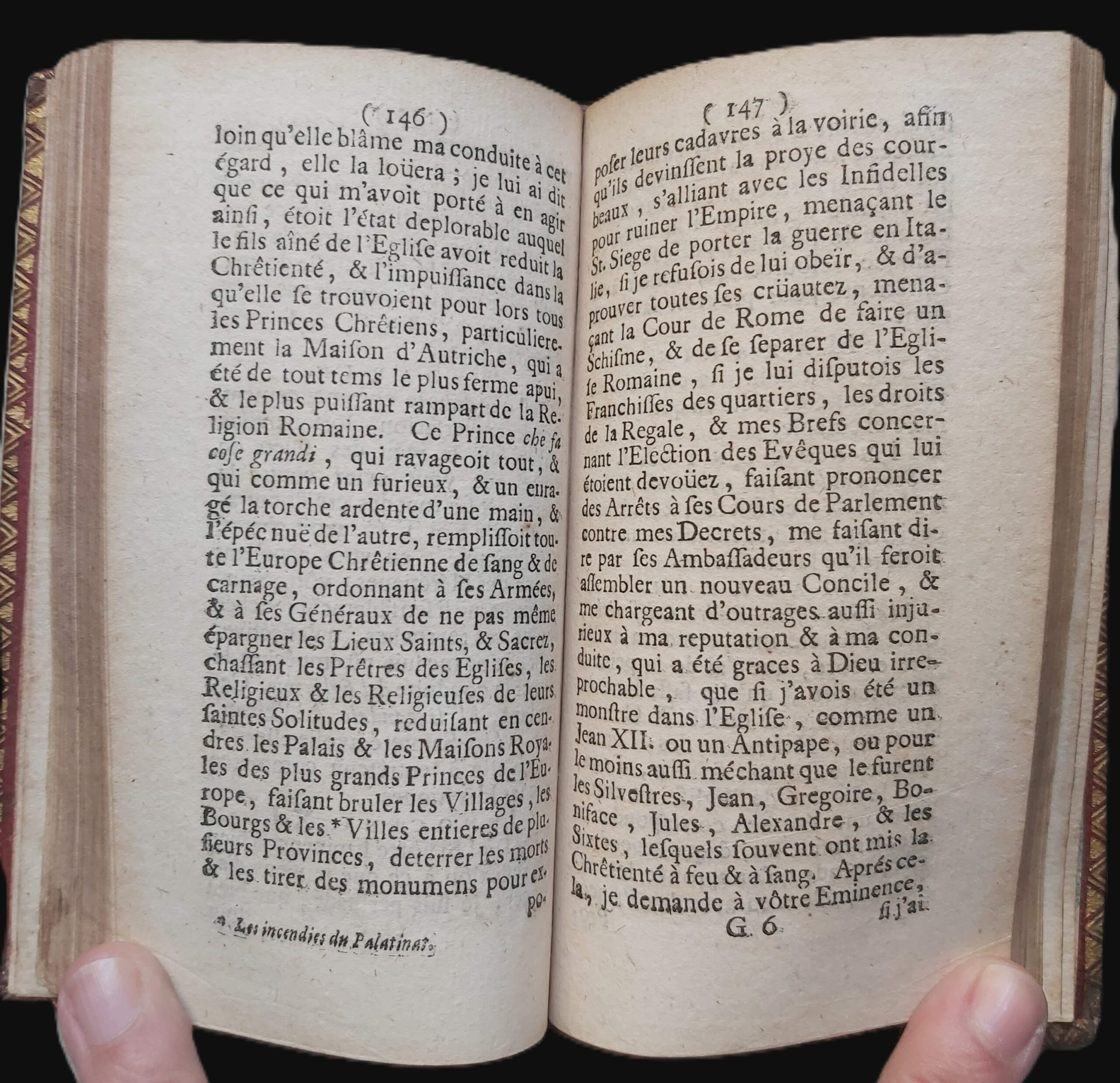 in-16, pp. 224, belliss. leg. marocchino rosso con fregi e tit. oro al d. Doppia cornice in oro ai piatti. Tagli dorati. Risguardi in carta dec. con dentelle. Front. a due colori. Un testamento fittizio redatto in forma di dialogo tra il Cardinale e Papa Odescalchi Innocenzo XI. Graesse I, 64: Cette satire, assez rare, attribue a Gatien de Courtilz…. Brunet I, 152. BL I, p. 270 non cita questopera. Belliss. esempl.