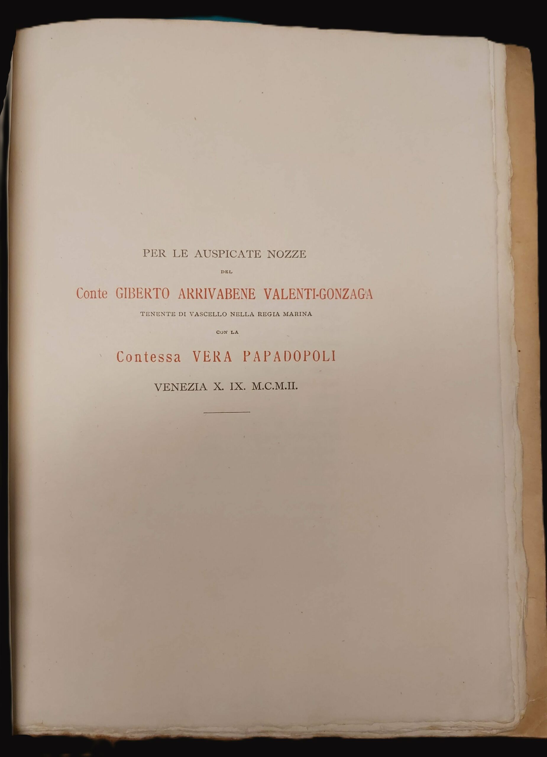 in-4, pp. 76, (2), bross. edit. con bella cop. liberty a colori incisa. Saggio dello storico mantovano sulla vita e operato di Leonardo Arrivabene, diplomatico di corte Gonzaga, con la trascrizione di carteggi originali tra i Gonzaga e i Medici, tra Leonardo Arrivabene e Margherita Paleologa, le gesta di Lodovico Gonzaga alla battaglia di S. Quintino, e altri documenti. Pubblicazione per nozze Conte Giberto Arrivabene Valenti-Gonzaga e Contessa Vera Papadopoli. Raro saggio pubblicato in soli 200 esempl. Rinforzo al d. Ottimo esempl. in barbe su carta distinta. [578]