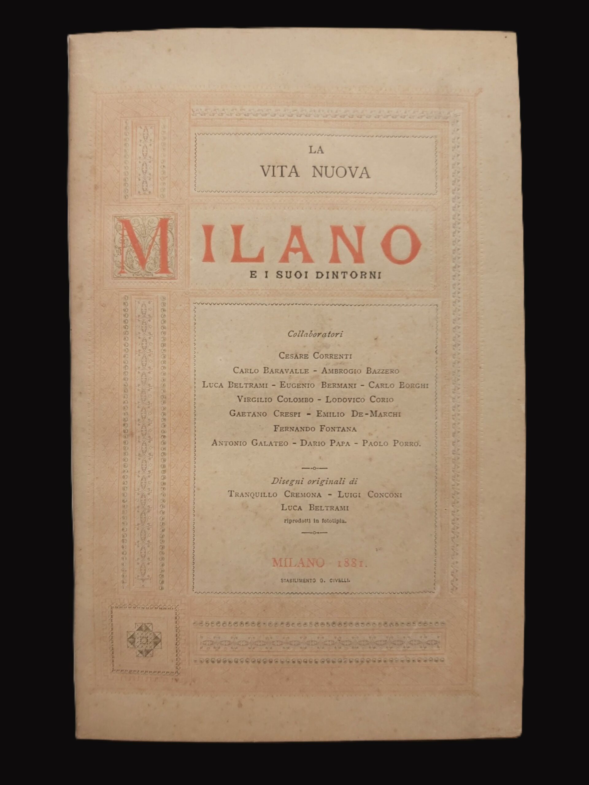 in-8, pp. 311, (4), rileg. m. tela coeva con tit. oro al d., conservate all’interno le cop. orig. Bella edizione di storia milanese con scritti di Cesare Correnti, Carlo Baravalle, Ambrogio Bazzero, Luca Beltrami, Eugenio Bermani, Carlo Borghi, Virgilio Colombo, Lodovico Corio, Gaetano Crespi, Emilio De Marchi, Fernando Fontana, Antonio Galateo, Dario Papa, Paolo Porro. Con disegni originali di Tranquillo Cremona, Luigi Conconi, Luca Beltrami riprodotti in fototipia. Ottimo esempl. [598]