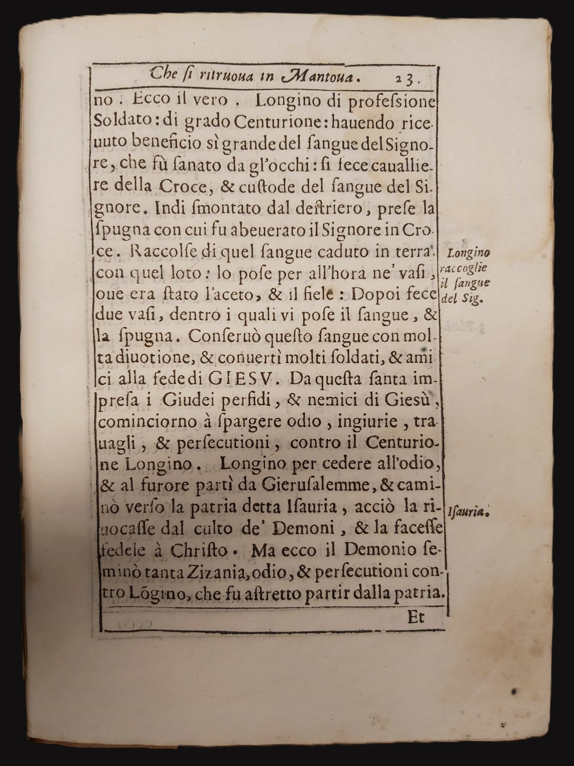 in-4 antico, cc 2, 38, bella leg. p. perg. molle coeva con tit. mss al d. Vignetta xilogr. al front. Front. e tutto il testo bordato. Iniziali, fregi e testat. xilogr. Dedicat. a Vincenzo Gonzaga Duca di Mantova. Rara opera, in prima e unica edizione, del teologo nato a Verona e morto a Pisa nel 1608. Dopo una premessa teologica l’A. narra della storia di Mantova, in particolare della reliquia e di San Longino, della verità e delle questioni legate alla devozione. Rara ediz. censita in sole 4 biblioteche italiane (L’Aquila, Seminario di Padova, Nazionale di Roma e Alessandrina di Roma). Ottimo esempl. [178]